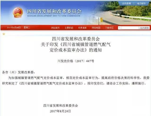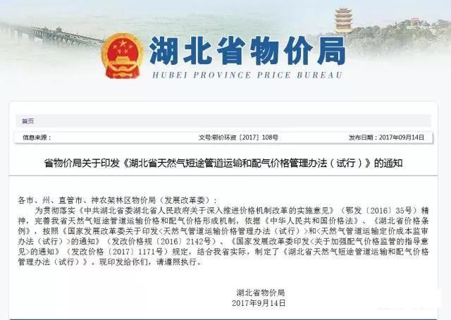 2017年發(fā)改委《關(guān)于核定天然氣跨省管道運輸價格的通知》,根據(jù)《天然氣管道運輸價格管理辦法(試行)》和《天然氣管道運輸定價成本監(jiān)審辦法(試行)》有關(guān)規(guī)定,對中石油北京天然氣管道有限公司等13家跨省管道運輸企業(yè)進(jìn)行了定價成本監(jiān)審,核定了中石油北京天然氣管道有限公司等13家跨省管道運輸企業(yè)管道運輸價格。自2017年9月1日起執(zhí)行。